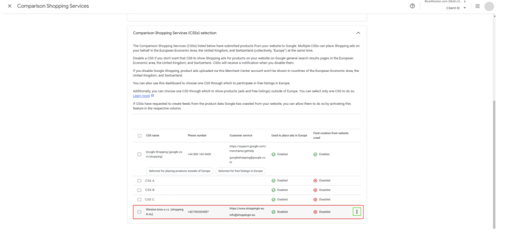 2. Po rozbalení lišty Výběr služeb pro porovnání cen (Comparison Shopping Services Selection – CSSs) mohou nastat dvě varianty:
